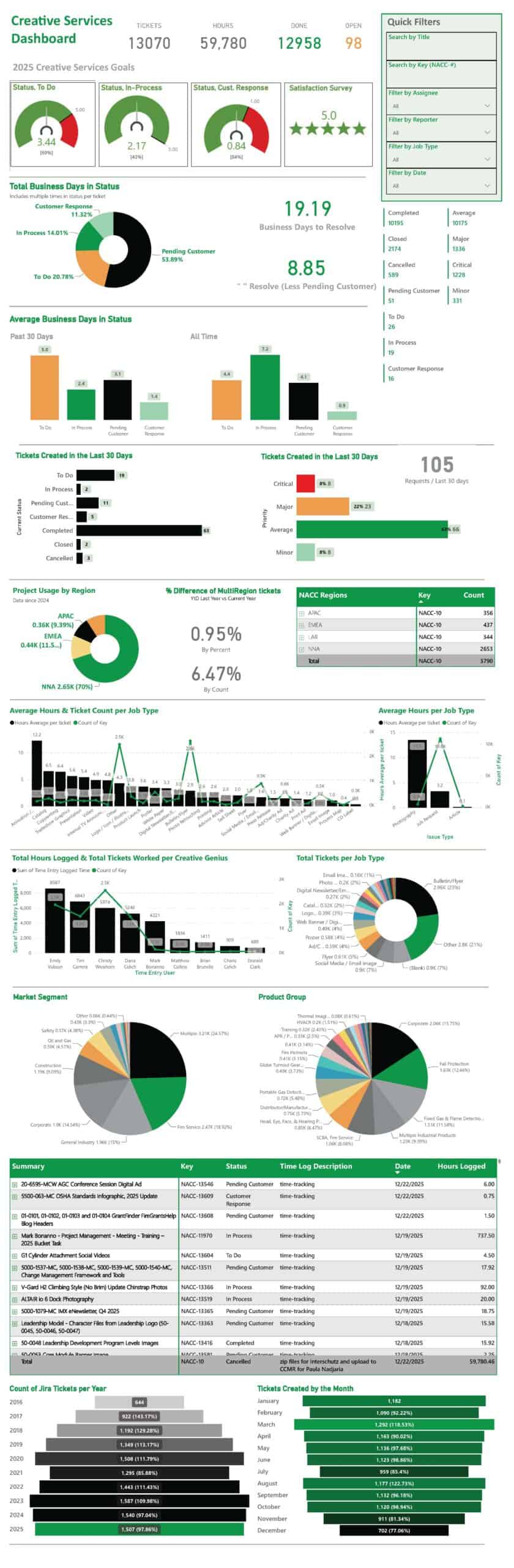 Gone are the days when output could not be measured. I built a dynamic Power BI dashboard that integrates project management data and team KPIs to bring transparency and accountability to Creative Services.