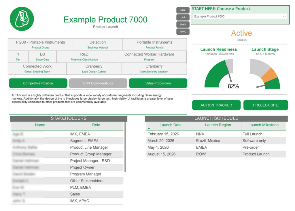 I’ve designed a dynamic Global Product Launch Dashboard that tracks all launches in real-time, providing clear visibility into current status and progress for executive insight. Note, I can only show a portion of the dashboard due to confidential information, and I prepopulated these details with an example product.